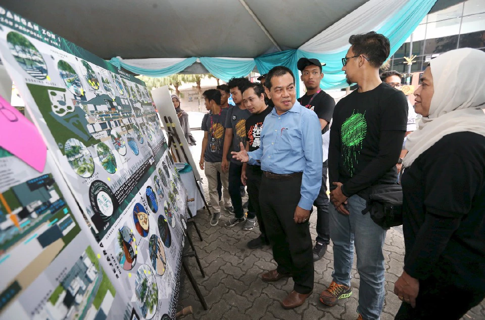 ISMAIL (tengah) bersama sebahagian pelajar melihat model plan pembangunan Sungai Segget, ketika program lawatan sempena Bengkel Senibina NEON Ke-29 dan Forum Segget Greatest yang dianjurkan UTM, di Johor Bahru. – Foto Mohd Azren Jamaludin (Berita Harian)