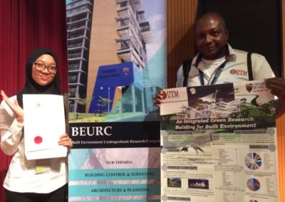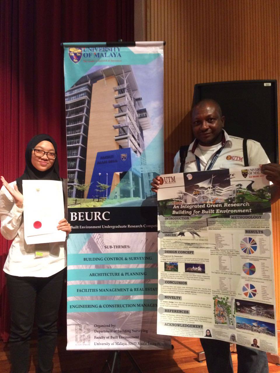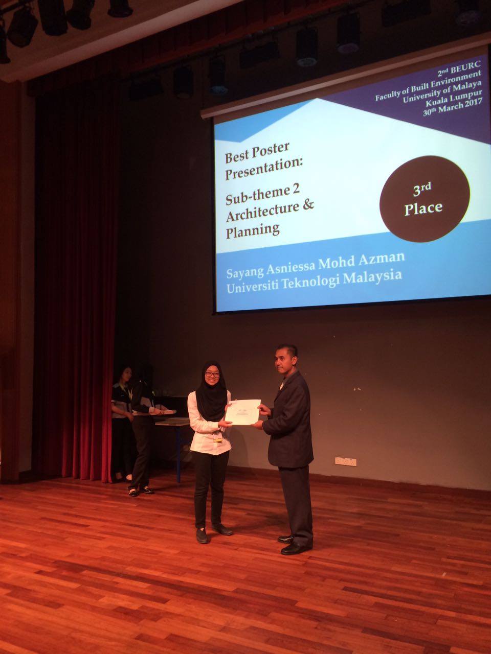 Won 3rd Place Best Poster in the just concluded 2nd International Built Environment Undergraduate Research Competition (BEURC) 2017 which was held on 30th March 2017 at the Mercu Alam Bina, University of Malaya, Kuala Lumpur, Malaysia. The paper was a product of Sayang Asniessa Bt Mohd Azman 2nd year 2nd Semester Design Studio Work 2015/2016 Session supervised by Dr. Malsiah Bt. Hamid. The outcome was an iconic green design for the built environment researchers. Ulrich (1983), Psycho-Evolutionary Theory (PET) for stress recovery was used to underpin the research.