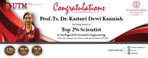 Congratulations to Prof. Dr. Mazlan Hashim and Prof. Ts. Dr. Kasturi Dewi Kanniah are listed as Top 2% Scientist in Geological & Geomatics Engineering based on the list published by Stanford University.
