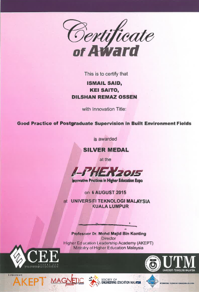 November 29 – UTM-ISIIC FAB-FKA team won a Gold Award at SIIF 2015 for the development and commercialization of PAWDEX, an Urban Walkability Index Analysis Model. The multidisciplinary research team which was spearheaded by Assoc. Prof Dr. Hasanuddin Lamit; consists of Dr. Arezou Shafaghat, Dr. Ali Keyvanfar, Dr. Kherun Nita Ali, Prof. Dr. Mohd Zaimi Abd. Majid, and Prof. Dr. Mohd Hamdan Ahmad. The research project was also supported by the Ministry of Science, Technology and Innovation (MOSTI), Malaysian Highway Authority (Lembaga Lebuhraya Malaysia-LLM), Qatar Road Safety Studies Centre (RSSC), and the Institute of Sultan Iskandar (ISI).