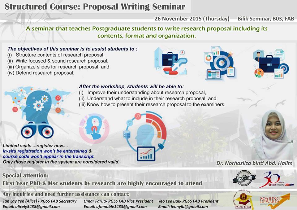 Participants are encouraged to take note when the speaker explaining about the proposal writing. Besides, students can also prepare their own research proposal and some questions to be raised during the seminar.