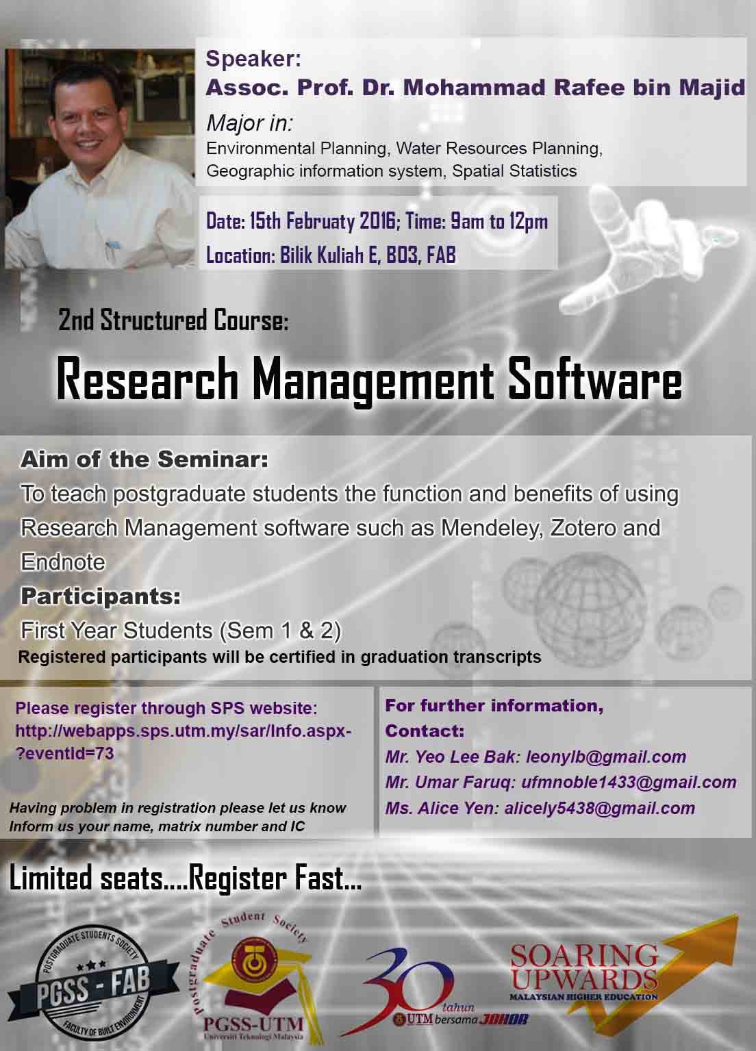 First year PG students and new registered students are highly encouraged to join. Register at: http://webapps.sps.utm.my/sar/Info.aspx?eventId=73