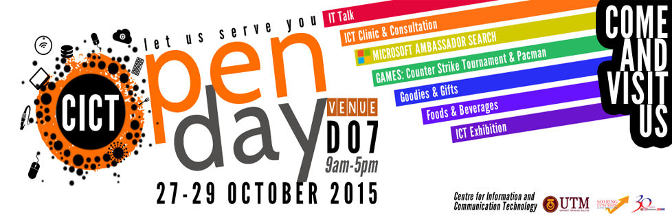 The Centre for Information and Communication Technology (CICT) cordially invites all staff and students to our Open Day, which will be held from the 27th – 29th October 2015, from 9am to 5pm. Please visit our website or facebook for details and updates of activities and programs.