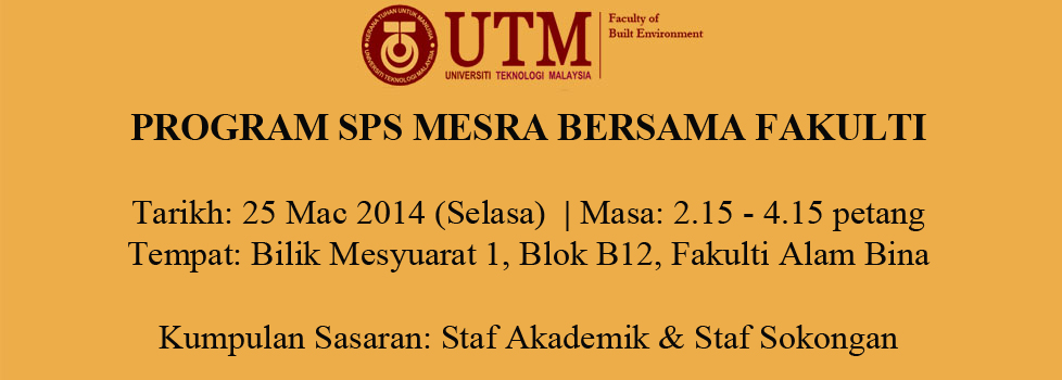 Jabatan Perancangan Bandar dan Wilayah menjemput semua warga Fakulti Alam Bina untuk hadir Seminar Bulanan JPBW. Seminar kali ini adalah istemewa kerana ia sesuai untuk semua peringkat pelajar di fakulti ini bukan sahaja kepada JPBW yang bertajuk “Art of Writing in University” yang akan diberikan oleh Dr. Adlina Abd Samad, dari Akademi Bahasa, UTM. Seminar ini dapat membantu pelajar dalam penyediaan penulisan (thesis dan assignment) terutama di dalam Bahasa Inggeris.