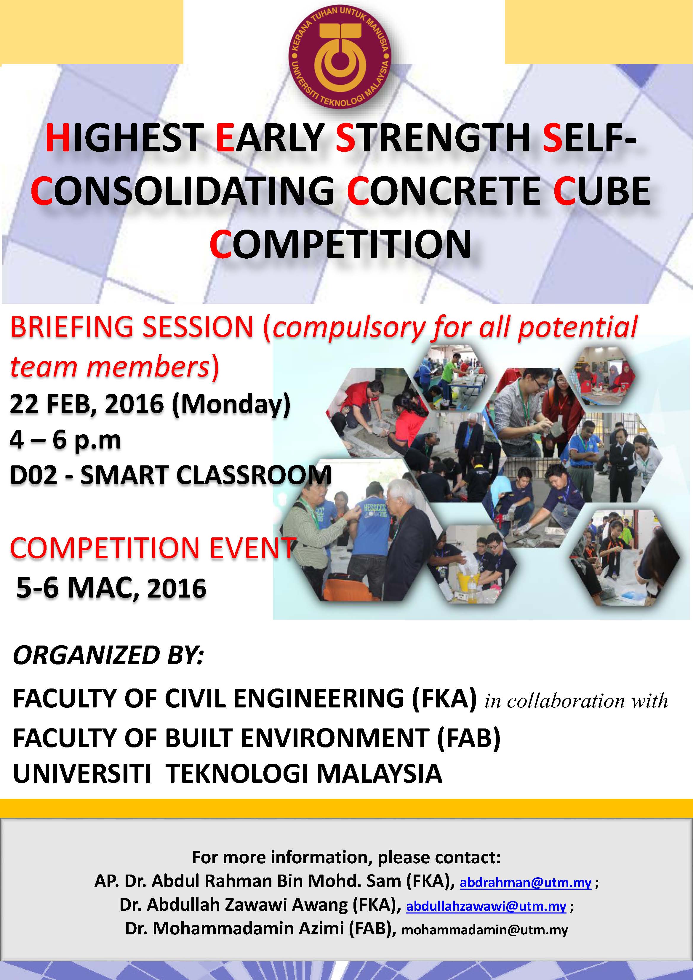 UTM in House HESSCCC2016 Highest Early Strength Self-Consolidating Concrete Cube Competition by webmaster FAB | Feb 14, 2016 | Featured Slider, News Registration Form