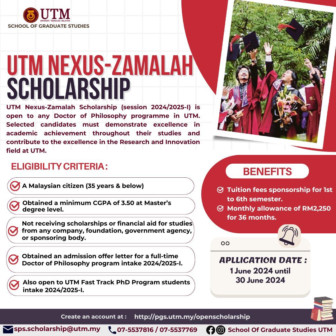 The ๐—จ๐—ง๐—  ๐—ก๐—ฒ๐˜…๐˜‚๐˜€-๐—ญ๐—ฎ๐—บ๐—ฎ๐—น๐—ฎ๐—ต ๐—ฆ๐—ฐ๐—ต๐—ผ๐—น๐—ฎ๐—ฟ๐˜€๐—ต๐—ถ๐—ฝ ๐—ณ๐—ผ๐—ฟ ๐˜๐—ต๐—ฒ ๐Ÿฎ๐Ÿฌ๐Ÿฎ๐Ÿฐ/๐Ÿฎ๐Ÿฌ๐Ÿฎ๐Ÿฑ-๐Ÿญ ๐˜€๐—ฒ๐˜€๐˜€๐—ถ๐—ผ๐—ป ๐—ถ๐˜€ ๐—ป๐—ผ๐˜„ ๐—ผ๐—ฝ๐—ฒ๐—ป ๐—ณ๐—ผ๐—ฟ ๐—ฎ๐—ฝ๐—ฝ๐—น๐—ถ๐—ฐ๐—ฎ๐˜๐—ถ๐—ผ๐—ป๐˜€ ๐—ณ๐—ฟ๐—ผ๐—บ ๐—๐˜‚๐—ป๐—ฒ ๐Ÿญ๐˜€๐˜ ๐˜๐—ผ ๐—๐˜‚๐—ป๐—ฒ ๐Ÿฏ๐Ÿฌ๐˜๐—ต, ๐Ÿฎ๐Ÿฌ๐Ÿฎ๐Ÿฐ. This scholarship supports postgraduate students pursuing a Doctor of Philosophy program at Universiti Teknologi Malaysia (UTM).