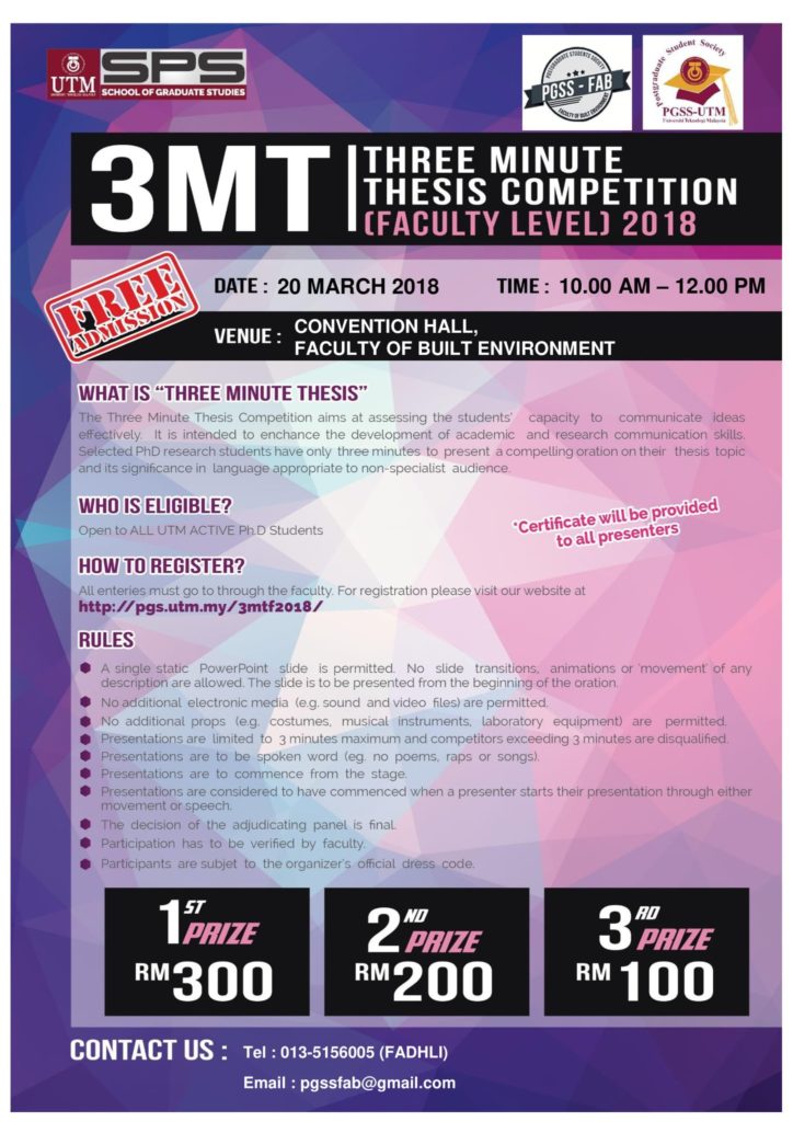 UTM School of Graduate Studies (SPS) incorporation with PGSS FAB cordially invited you to join 3MT Competition 2018 (Faculty Level) FAB UTM.