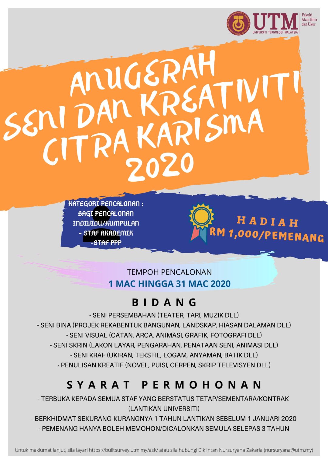 Untuk maklumat lanjut sila ke website Anugerah Citra Karisma (https://builtsurvey.utm.my/fabu2024/