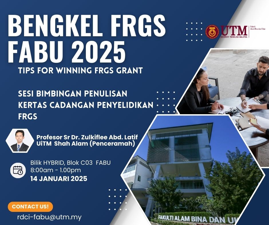 BENGKEL PERSEDIAAN PERMOHONAN SKIM GERAN PENYELIDIKAN FUNDAMENTAL (FRGS) 2025 highlight Skills Posted on January 14, 2025 ← LANDSCAPE ARCHITECTURE ALUMNI MEET AND NURTURE (LAAMAN) 2025 Sundanese Cultural & Heritage Exhibition @ Galeri FABU! →