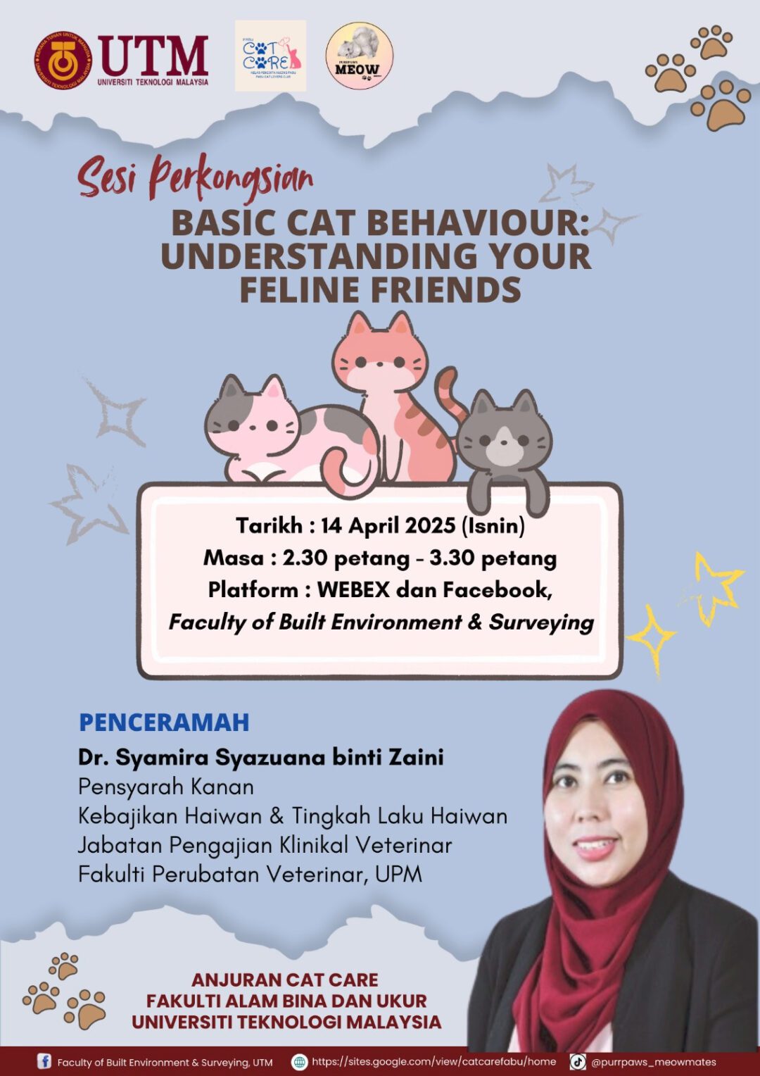 Sukacita dimaklumkan bahawa CatCare Fakulti Alam Bina dan Ukur (FABU) akan menganjurkan sesi perkongsian seperti maklumat dibawah :