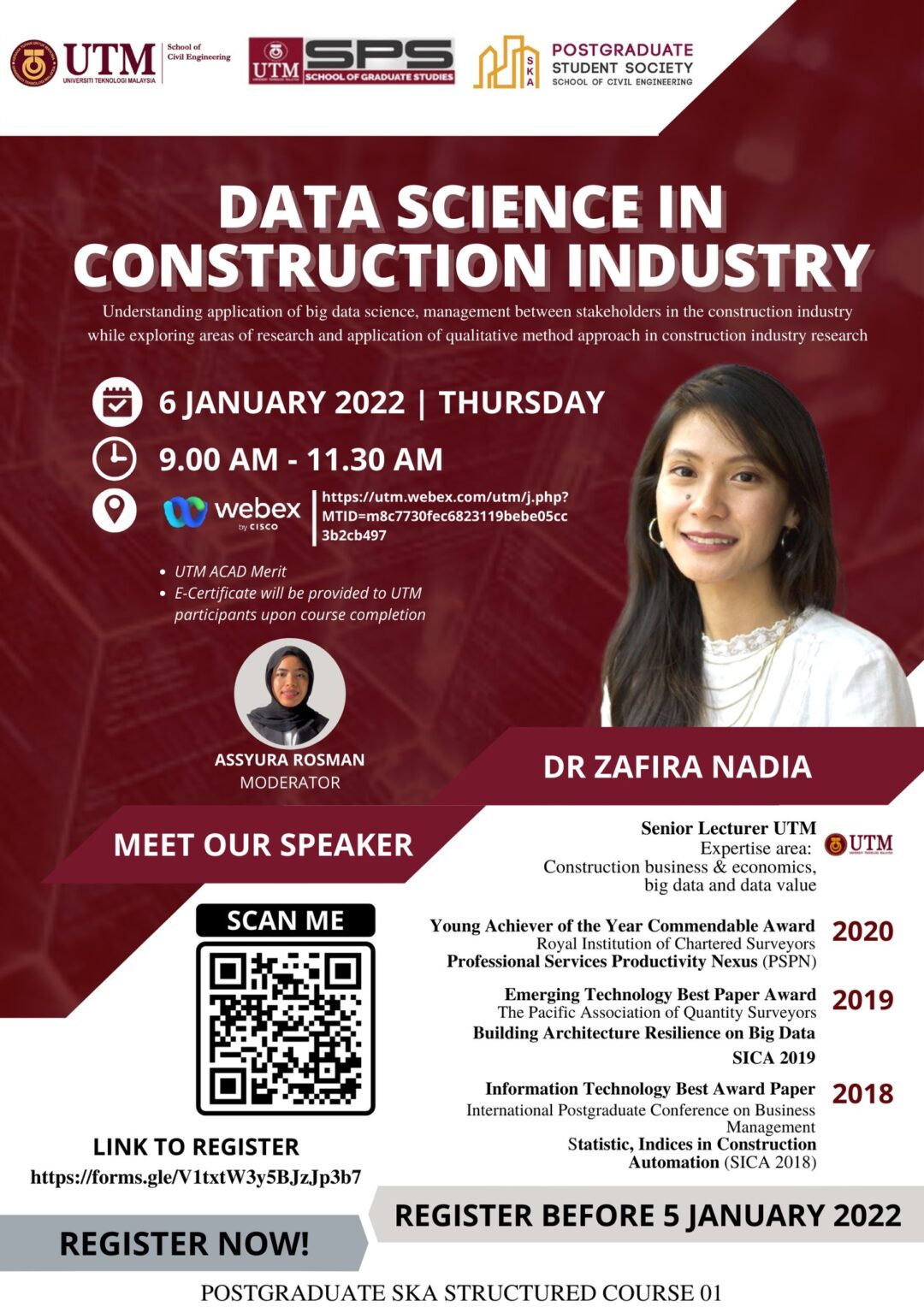 “Data Science in Construction Industry” highlight Date: 6/01/2021 (Thursday) Time: 9.00 am – 11.30 am Venue: Cisco Webex Speaker: Dr. Zafira Nadia Don’t miss this opportunity and come to join us! Pre-register at: https://forms.gle/V1txtW3y5BJzJp3b7 Webex Link: https://utm.webex.com/utm/j.php. Skills Posted on December 28, 2021 ← FABULOUS OGC 2021 Terima Kasih →