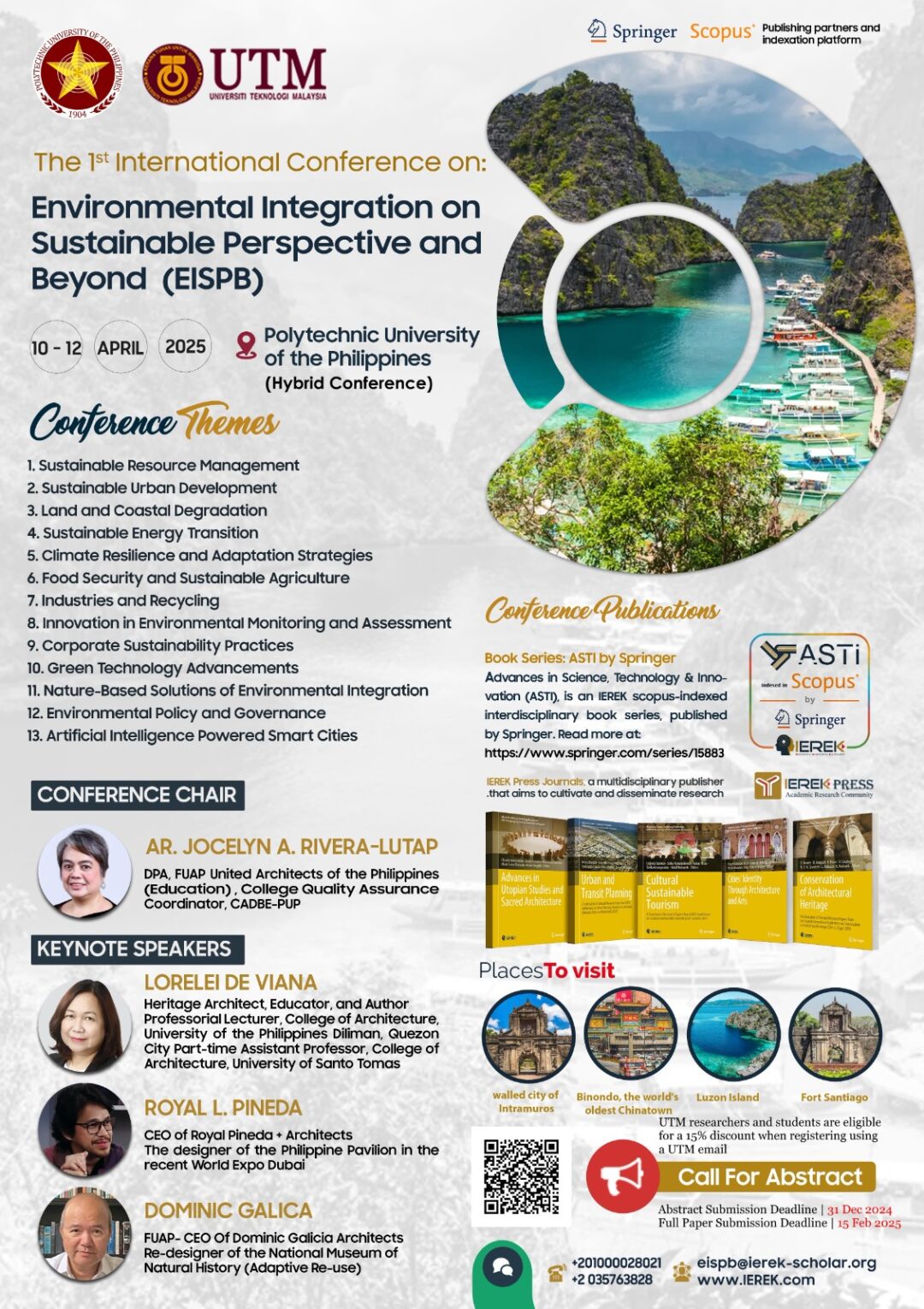 ๐ Organized by IEREK, Polytechnic University of the Philippines, and the Faculty of Built Environment and Surveying, UTM Johor Bahru, this hybrid conference offers the perfect platform to kick-start your journey in international research and connect with experts in the field of sustainability.