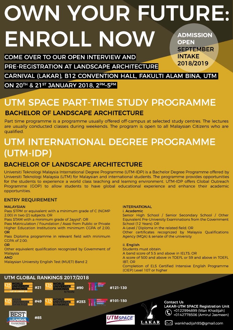 1) Open Interview and Registration for Bsc. in Landscape Architecture UTM SPACE (Part Time Study Programme & UTM International Degree)