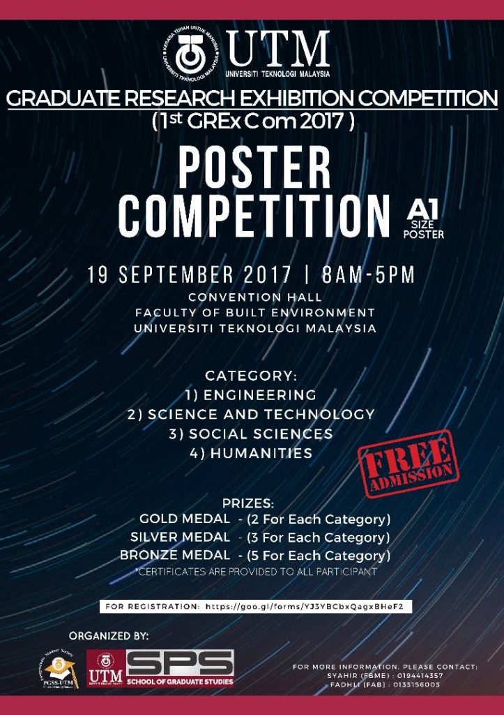 Postgraduate Students Society (PGSS) UTM in collaboration with School of Graduate Studies (SPS) UTM proudly announces the 1st Graduate Research Exhibition Competition (GREx Com) which will be held as follows: