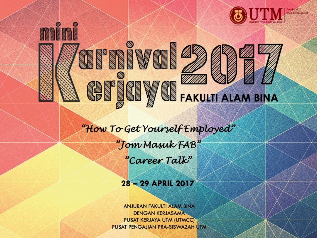 We are please to welcome everyone to our Mini Career Carnival 2017 at Fakulti Alam Bina on 28th-29th April 2017. This Mini Career Carnival is aimed for all students in UTM, exclusively from FAB. Students will be given an opportunities to meet the organisation’s representatives, tips to communicate effectively in interviews and learn more about the possible career path. Our recent graduates are also welcome to attend. Organisation will promote their internships, placements and graduates vacancies during the Mini Career Carnival 2017 FAB.