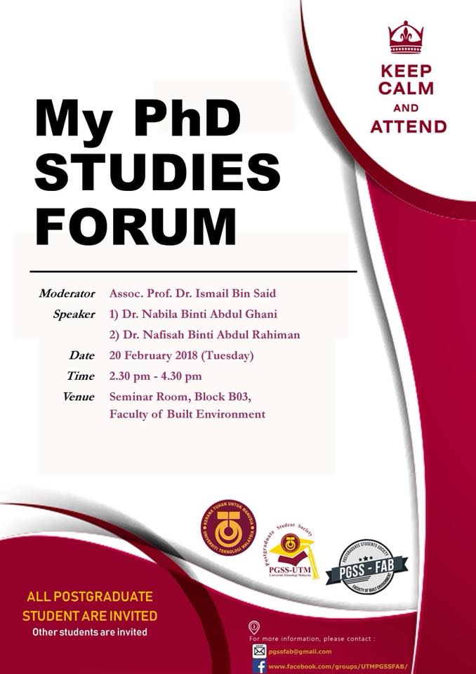 We’re here to bring more exciting forum like this for you guys. UTM PGSS FAB cordially invited you to join My PhD STUDIES FORUM. Details are as follows:
