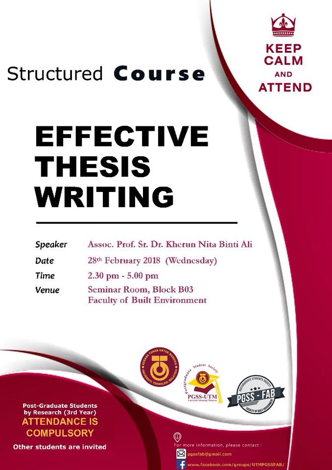 UTM PGSS FAB cordially invited all of you to join the STRUCTURED COURSE – EFFECTIVE THESIS WRITING and details are as follows:
